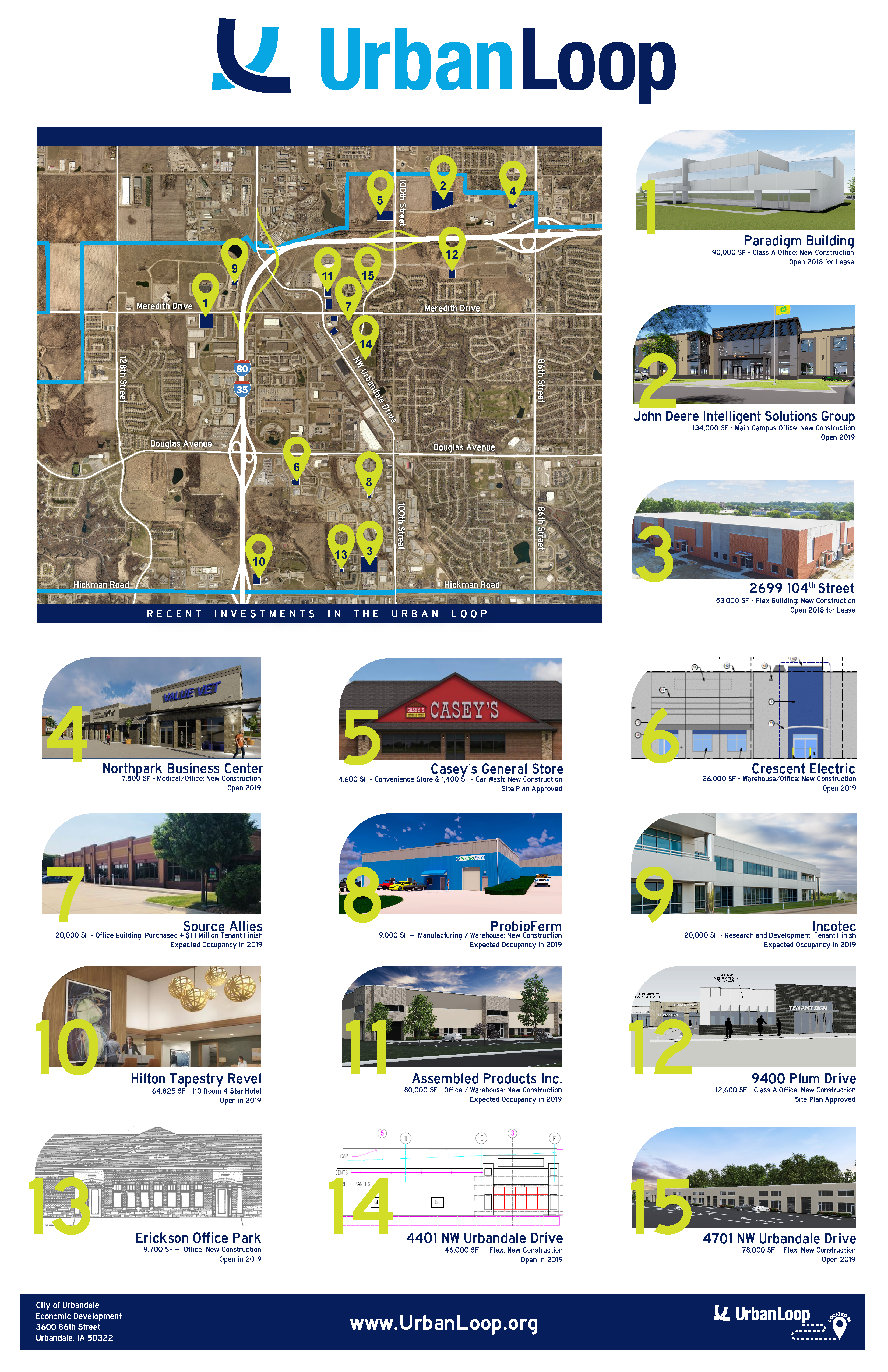 Urbandale, IA – Calendar Year 2018 saw the full implementation and success of the Urban Loop, a development area anchored by the 90-degree-bend in interstate 35/80 formerly known as Rider Corner. In the first 12 months after the City launched the Urban Loop development initiative, 14 commercial developments have chosen to locate or expand in Urbandale's Urban Loop.